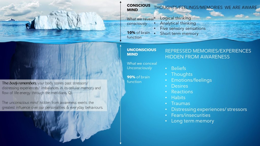 The bulk of the iceberg that lies beneath and unseen represents our unconscious mind. This is where our repressed memories, experiences that is hidden from our awareness and what we conceal unconsciously. This is the reservoir of our beliefs, protective reactions, distressing experiences, habits, emotions, insecurities, stressors, trauma and long-term memory. Importantly, this is 90% of our brain function and hidden from our awareness, it exerts the greatest influence over our everyday behaviours and actions. For many, more than 90% of actions is unconscious.